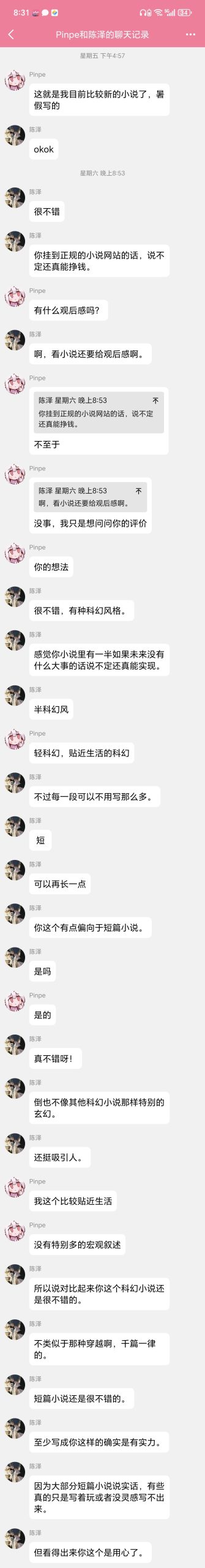 对了,有个同学看了我的小说,也给出了很高的评价: